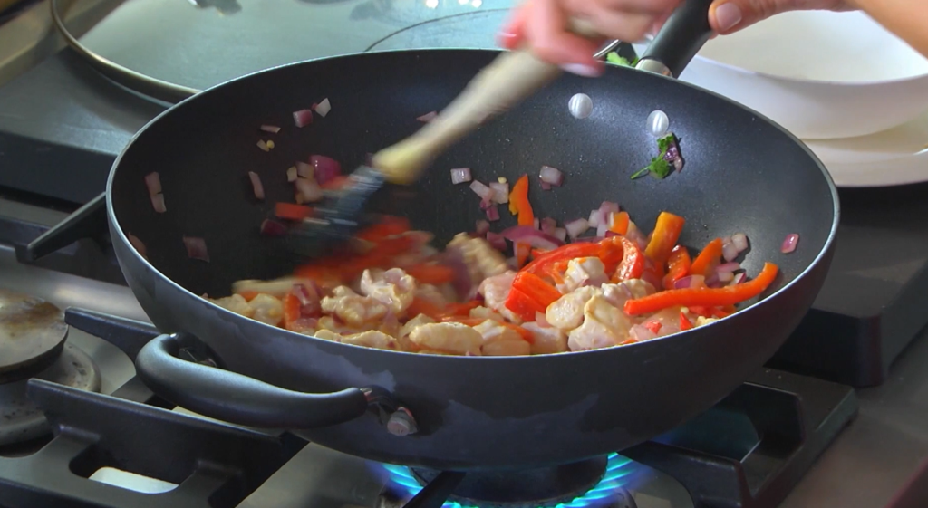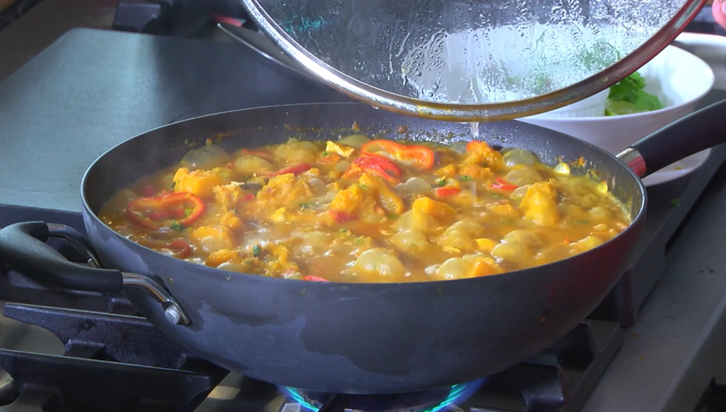 Red onions and red bell peppers add both visual appeal and depth of taste. The onions bring a gentle sweetness while the peppers contribute a mild, fresh brightness. When sautéed together, these ingredients form the aromatic base of the curry, creating a flavourful foundation before the chicken or chickpeas are added to the pan.