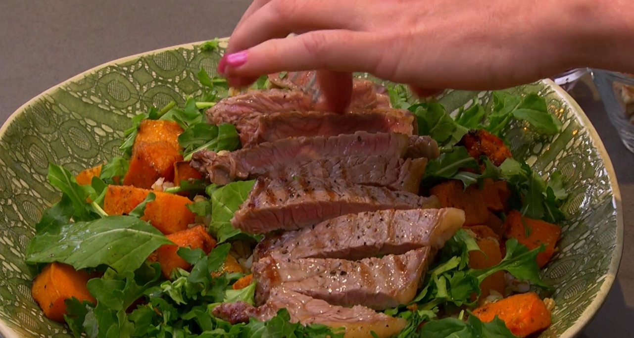 Today we’re preparing a hearty Butternut, Barley and Steak Salad, a wholesome bowl layered with nutty pearl barley, roasted cumin-spiced butternut, fresh rocket, and perfectly seared steak. Finished with a zesty garlic, ginger and pomegranate dressing, plus crunchy walnuts and pumpkin seeds, this dish brings together warmth, freshness and bold flavour in every bite.