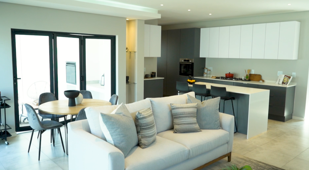 Because the home featured open-plan living within a compact cluster layout, proportion was critical. Furniture selections respected the scale of each room, ensuring movement and flow remained unobstructed. To offset the linear architecture of sofas, cabinetry, and television walls, circular forms were introduced: a round dining table, curved coffee tables, and softly contoured patio seating. These rounded silhouettes created visual interest while preventing the space from feeling rigid. In smaller properties, especially, balancing straight lines with curves can soften the environment and subtly expand the perception of space.