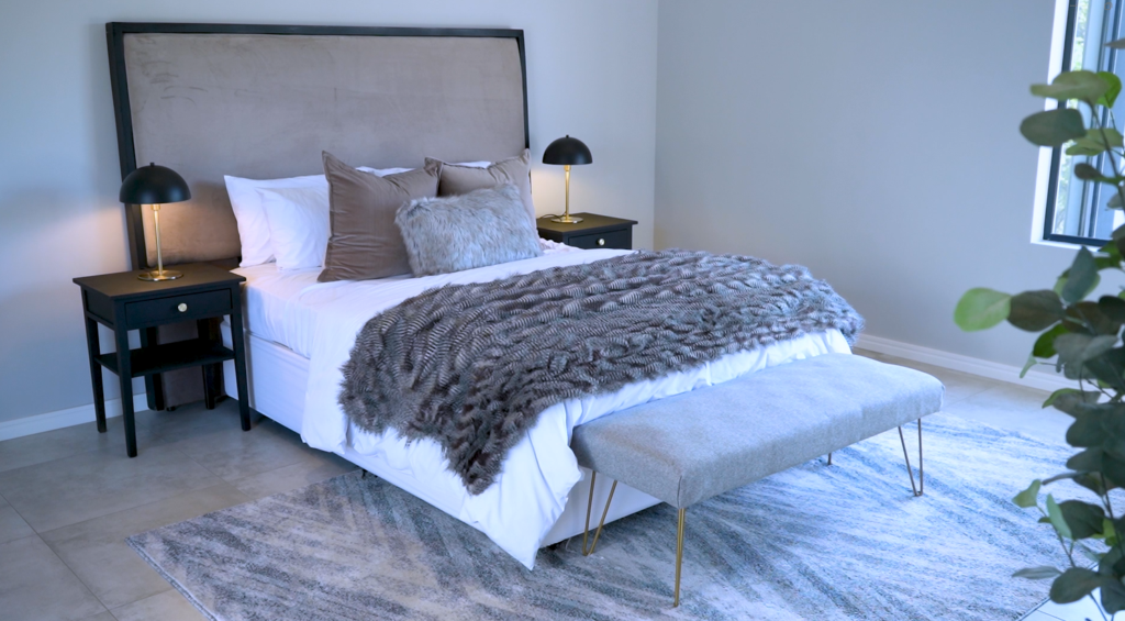 The design direction embraced minimalism while avoiding sterility. Working with the property’s existing palette of greys and whites, the staging introduced warmer tones of taupe, cream, and natural wood to soften the aesthetic. Black accents, paired subtly with touches of gold, threaded continuity throughout the interiors, adding depth and quiet sophistication. Texture played a leading role. A patterned rug anchored the living area, its dark flecks echoed in scatter cushions and occasional chairs. The interplay of fabrics, woven textiles, smooth finishes, and tactile surfaces added dimension without overwhelming the eye. Every choice felt intentional, cohesive, and restrained.