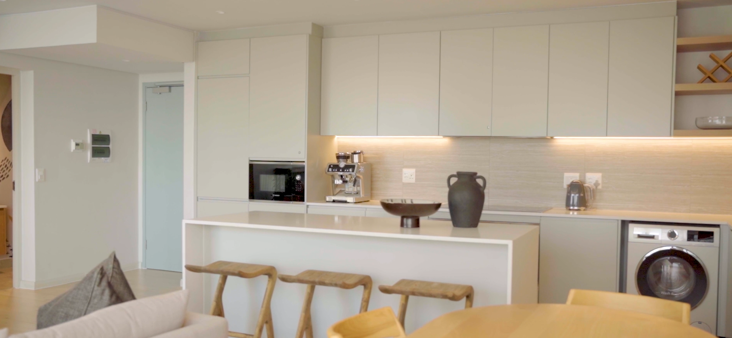 From the outset, the approach centred on scale using oversized furniture and custom pieces to enhance the perception of space while ensuring every square inch is utilised. The layout flows effortlessly, drawing the eye toward expansive windows that frame uninterrupted views of Cape Town’s harbour. A muted palette in the communal areas sets a calm foundation, allowing the architecture and views to take centre stage.