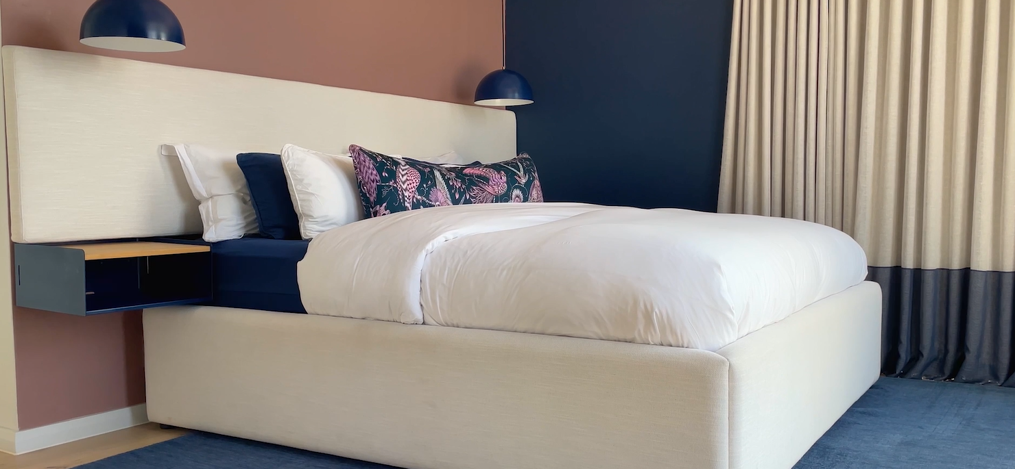 The bedrooms extend the narrative through texture and contrast. A fully upholstered, wall-to-wall headboard in one room required installation via the building’s exterior, an unconventional solution that underscores the project’s ambition. In the main bedroom, blush pink tones are elevated with deep navy accents, transforming a challenging colour palette into a sophisticated, balanced retreat overlooking the bay.