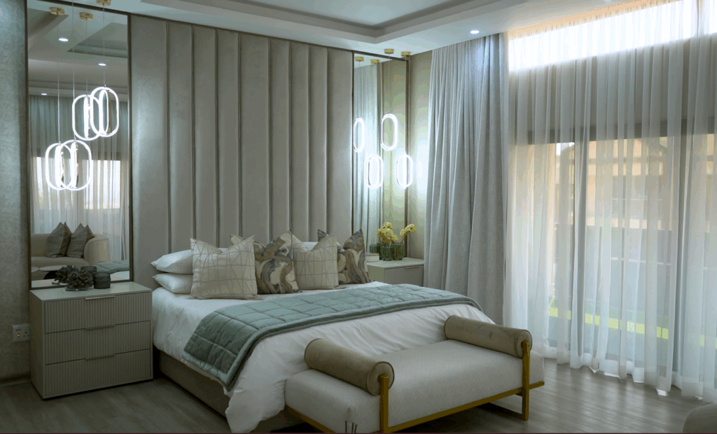The main bedroom channels quiet grandeur hotel opulence meets homey warmth. A wall-to-wall upholstered headboard with mirror insets anchors the room, while custom bedside tables in soft tones, finished with rippled drawers and gold detailing, complete the look. “We wanted it to feel indulgent, but not intimidating,” says Lindiwe. “Luxury should be lived in.” A daybed with plush bolsters and a curved mini-lounge offer retreat within retreat each corner designed for comfort and calm.